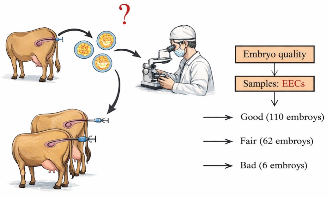 - Embryo quality is a key driver of multiple ovulation and embryo transfer (MOET) performance and is shaped by both the uterine milieu and endocrine signaling. This study tested whether donor cows classified by embryo quality at day 7 after artificial insemination (AI) could be discriminated using cDNA fingerprinting derived from endometrial epithelial cells (EECs). Embryos and EECs were recovered by nonsurgical uterine lavage, and embryos were graded using International Embryo Technology Society (IETS) criteria. Donors were grouped according to embryo quality outcome (good, fair, and bad), and random amplified polymorphic DNA PCR (RAPD-PCR) was conducted with 11 UFPF primers on EEC-derived cDNA. In parallel, follicle-stimulating hormone (FSH), luteinizing hormone (LH), and pregnancy-associated plasma protein A (PAPP-A) in uterine fluid were quantified by ELISA. RAPD banding profiles, combined with UPGMA-based clustering, yielded distinct patterns that separated EEC groups. Endocrine profiling further indicated reduced FSH and PAPP-A in uterine fluid from the outcome group relative to higher-quality groups. Collectively, EEC cDNA fingerprinting together with uterine endocrine measures may serve as complementary indicators associated with bovine embryo quality, although marker identification beyond pattern-based discrimination remains necessary. - COLLAPSE