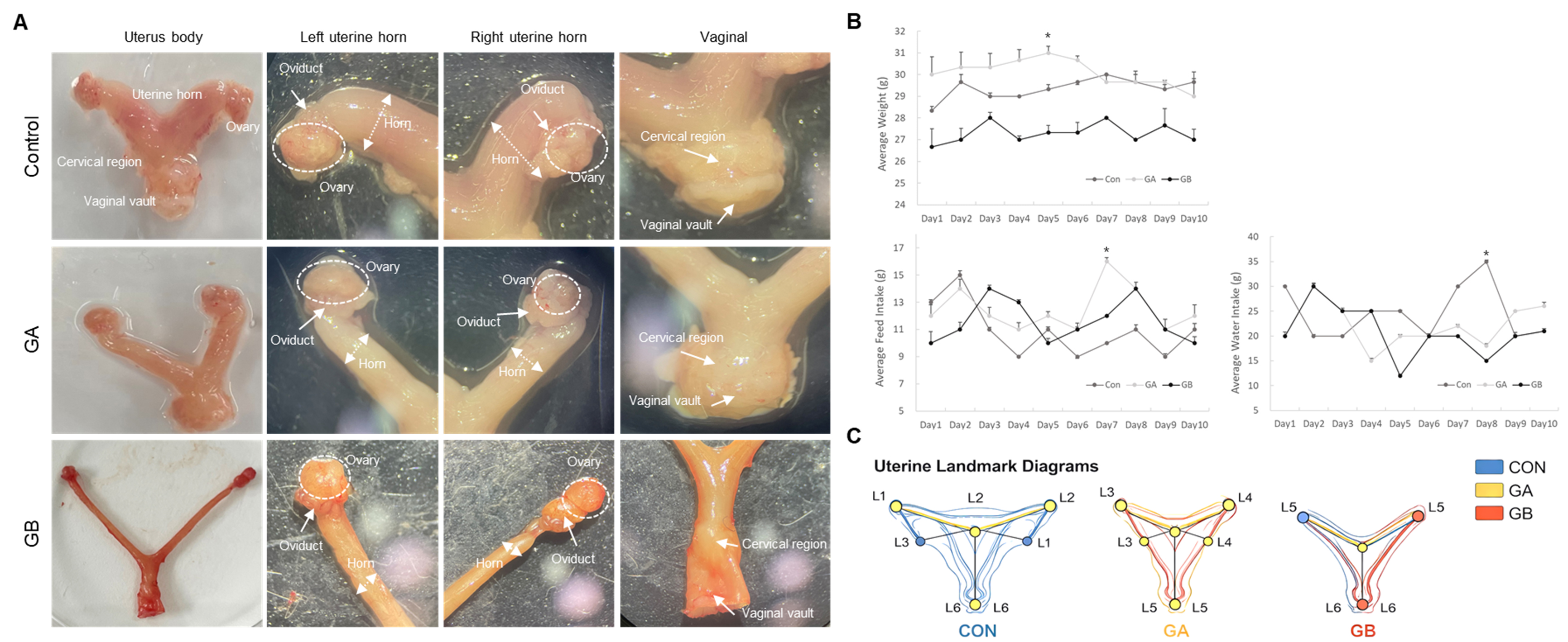 - This study evaluated the effects associated with energy drinks containing different caffeine levels on systemic metabolism and the reproductive microenvironment under superovulation-induced conditions. Female ICR mice were subjected to repeated administration of equine chorionic gonadotropin to induce a follicular hyperstimulation state and were then orally administered either a low-caffeine or high-caffeine energy drink. Changes in body weight and intake, white blood cell counts and differentials, plasma redox-related metabolic signals, plasma protein electrophoretic patterns, peri-uterine fat mass, and histological features of the ovary, uterus, and oviduct were analyzed. In the low-caffeine group, reductions in food intake and attenuation of body weight gain were observed, whereas hematological changes were limited. In the high-caffeine group, total white blood cells and neutrophils increased, plasma metabolic signals shifted toward a more oxidative state, and peri-uterine fat mass decreased. Histological assessment showed follicular regression and cystic changes in the ovaries of energy drink-treated mice. In the uterus, luminal dilation and stromal edema varied, accompanied by alterations in endometrial architecture. In addition, reduced staining intensity for acidic mucus was observed in the oviduct and uterus. In contrast, plasma protein electrophoretic patterns did not show prominent structural differences among groups. Collectively, these findings suggest that, under hormonally perturbed conditions such as superovulation, exposure to a high-caffeine energy drink is associated with greater systemic stress-related changes and concomitant alterations in the reproductive tissue microenvironment than exposure to a low-caffeine product. - COLLAPSE