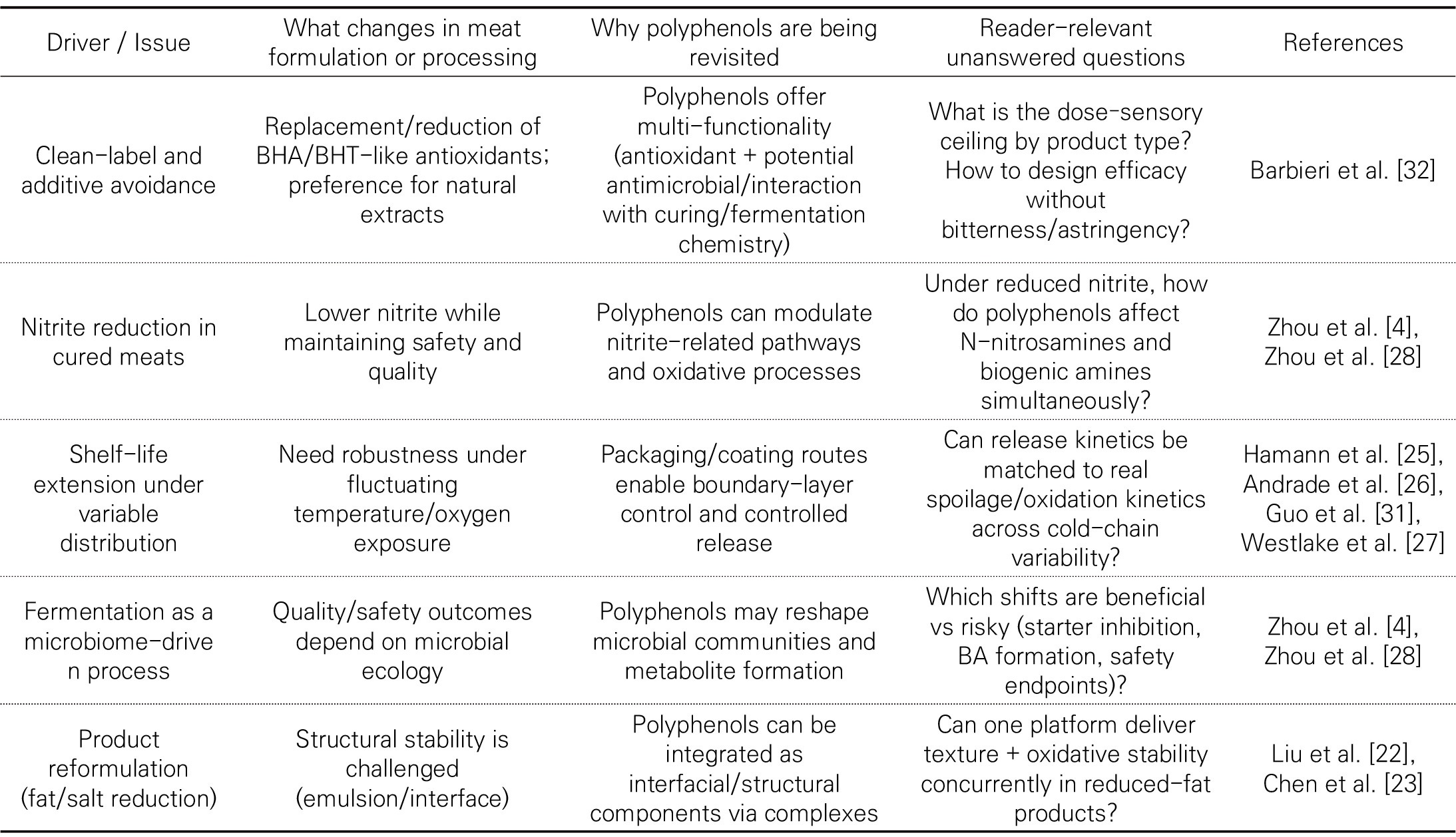 - Growing consumer demand for clean-label meat products has accelerated efforts to replace synthetic antioxidants with plant-derived polyphenols, yet practical adoption remains constrained by sensory impacts, limited solubility, and instability under processing and storage conditions. This review synthesizes recent evidence on how polyphenols can be rationally integrated into diverse meat matrices to enhance quality and safety outcomes, with emphasis on oxidation control and the mitigation of nitrite-related hazards. Beyond conventional performance endpoints (e.g., TBARS and VBN), we highlight multi-dimensional assessment frameworks that connect physicochemical changes with microbial ecology and safety markers, including biogenic amines and nitrosamines. Mechanistically, polyphenols act not only as radical scavengers but also as modulators of processing microenvironments and microbial communities, as demonstrated in reduced-nitrite fermented sausage models interrogated via integrated metabolomics and metagenomics. To address industrial bottlenecks, we discuss formulation and delivery innovations such as cyclodextrin-based inclusion complexes for improved dispersion and thermal robustness in low-salt sausages, controlled-release biopolymer films, and edible coatings that demonstrably delay lipid oxidation during extended refrigerated storage. Finally, we propose a translational roadmap for commercialization, focusing on dose–response standardization, sensory-risk management, migration/safety considerations for active packaging, and mechanism-guided selection of polyphenol structures and delivery platforms. - COLLAPSE